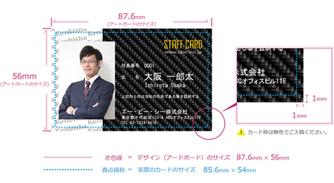 ※ヨコ85.6mm × タテ54mmのカードの場合、ヨコ87.6mm × タテ56mmで作成してください。