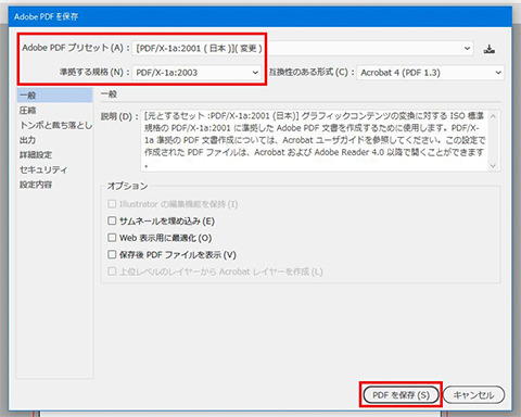 PDF形式でファイルを保存するときは以下の設定で保存してください。